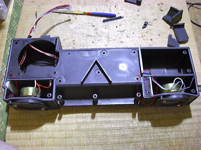 2. 内蔵のスピーカユニットがマザーボードに干渉しないように、ユニットを削る。