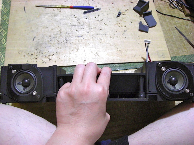 左右にスピーカーを取り付けたところ。ウーファーとかの工作は、まだです。