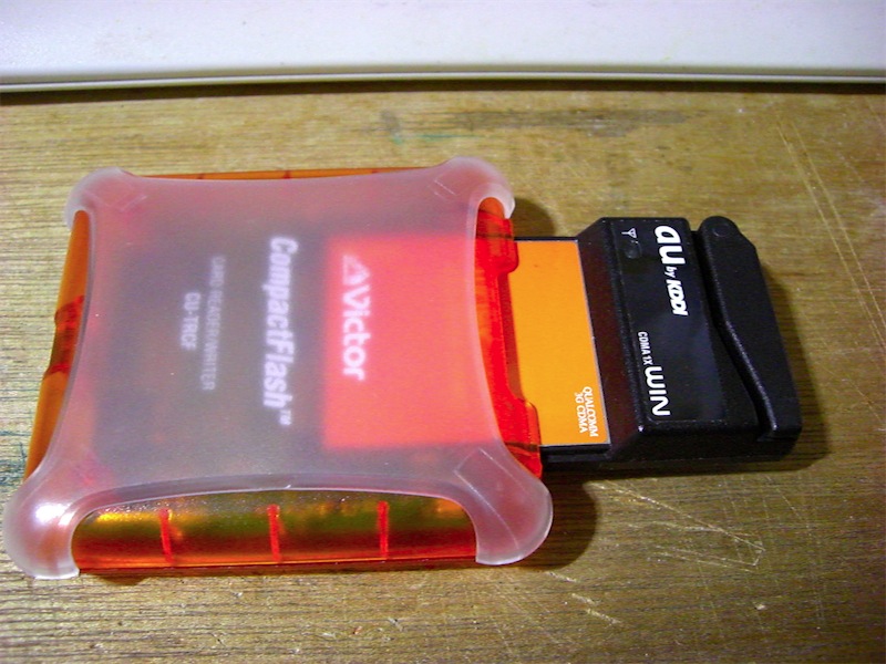 コンパクトフラッシュ(以下 CF )の形状をしている W05K が PCMCIA アダプターに挿してあります。