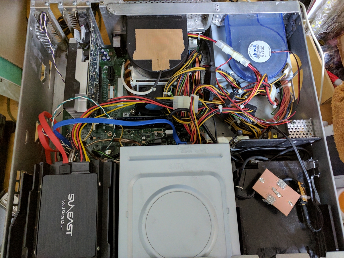 あとでちゃんと固定用の部品を作り直す予定です。 - CPU 冷却ファンは本来は 7 cm の物でしたが、 4 線対応のファンが 5 cm の物しか手元に無かったので強引に取り付けました。