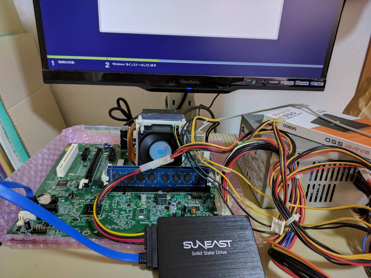 中身を更新した理由は、メモリが 4 GB しか乗ってなくて度々メモリ不足に陥ってたのと、あまりに古すぎて嫌気が差していたからです。とはいえ、 Vostro 3800 も 4 年くらい前の製品ですけどね。なぜ私が DELL の部品を意固地に使い続けるかというと、普通に自作すると Windows のライセンスを買い直さないといけないからです(笑)。以下は動作確認中の写真です。ついでに Windows 10 pro 64bit をインストールしています。
