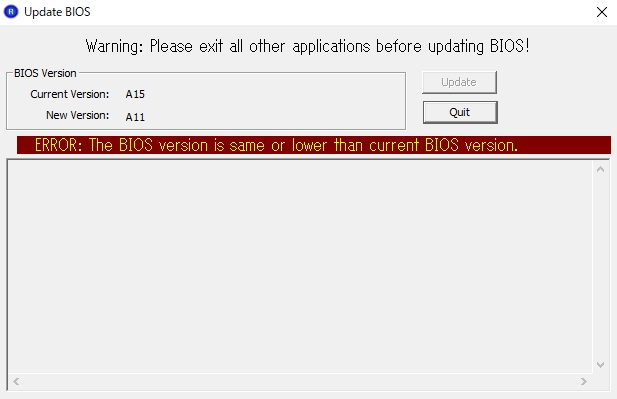 Inspiron3847 の A11 を同様に記入しようとすると、プログラムは起動するけど「更新しようとしている BIOS が今のよりも古いので無理」と言われる。
