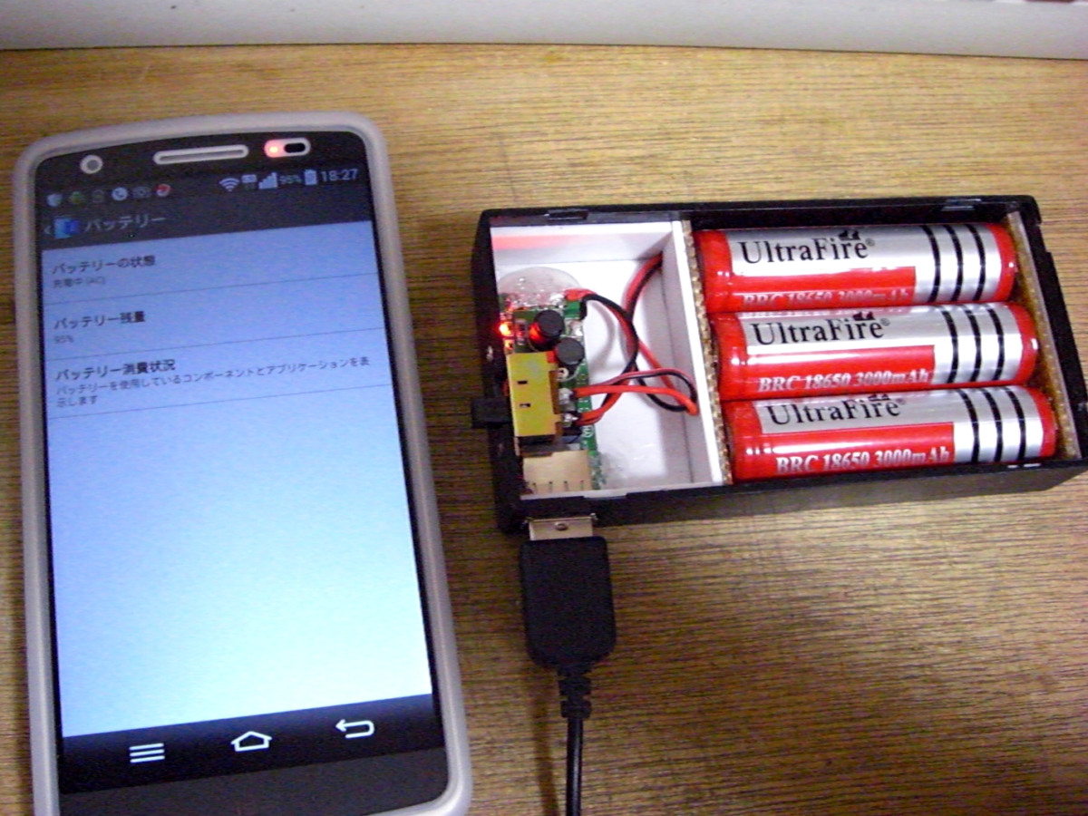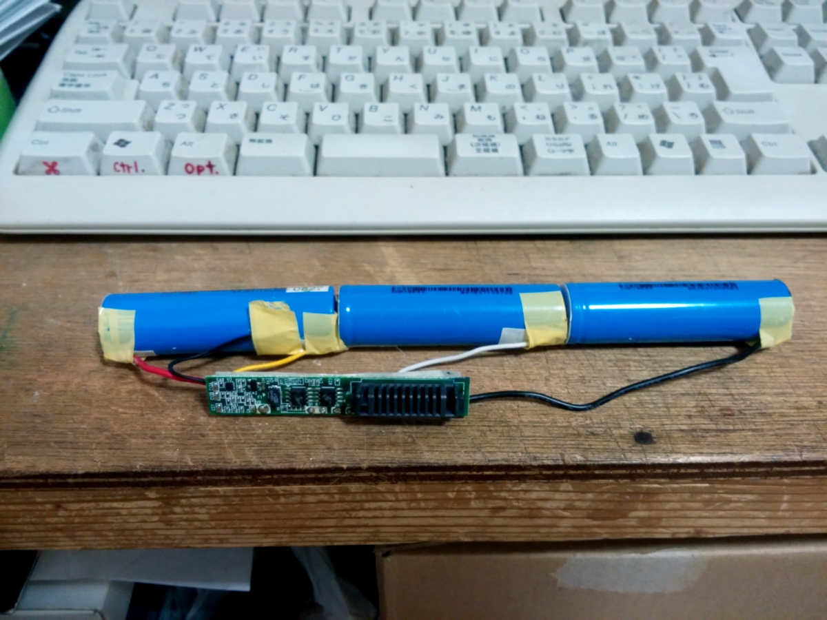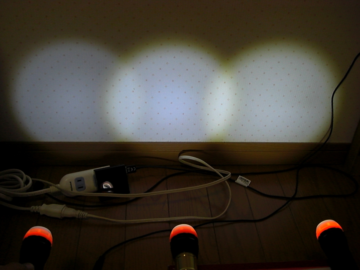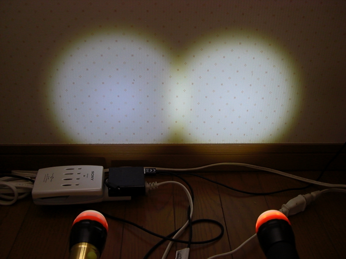さて、昇圧回路 1 つあたりの定格出力は 4.6 V , 0.4 A ( 1.84 W )ですが、二次側に抵抗は使用していません。 満充電の二次電池( eneloop , 1900mAh x 2 )を使用した時に、昇圧回路の出力電圧が降下して 3.7 V 程度で動作します。 この時の昇圧回路の出力が推定 3 W 程度( 3.7 V , 0.8 A )で、経時変化でみるみる電圧が下がっていく仕様になっています。
