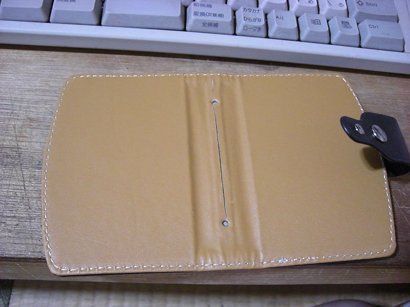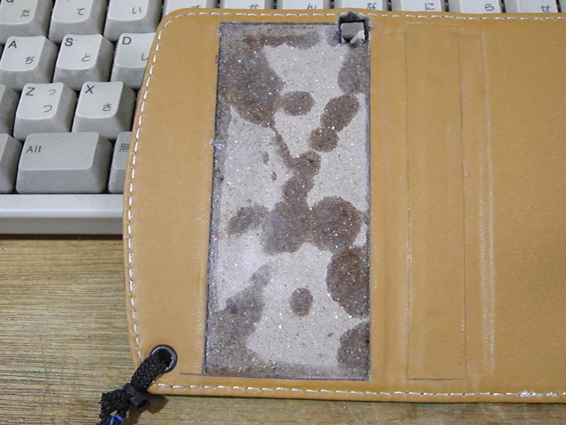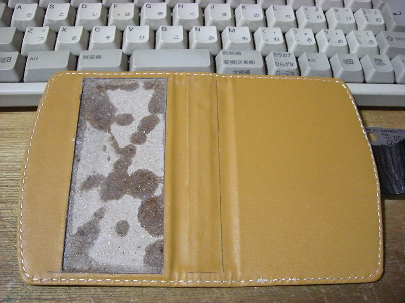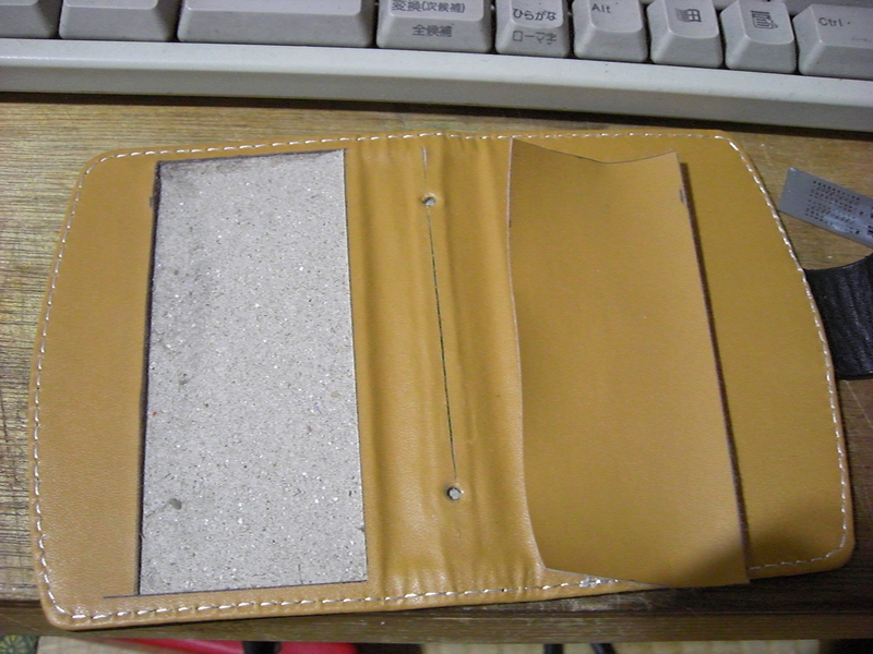 ついでに、余った革を適当に切って、中央部分に貼っておきます(右)。